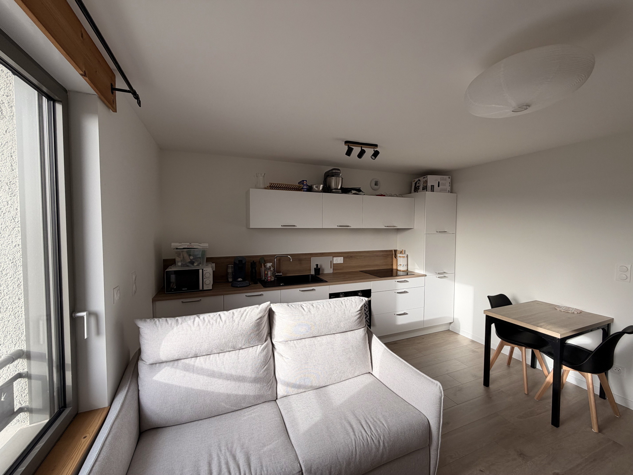 Entrée , cuisine entièrement équipée et très fonctionelle avec espace salon et vue sur le lac de Remoray , très bon ensoleillement .