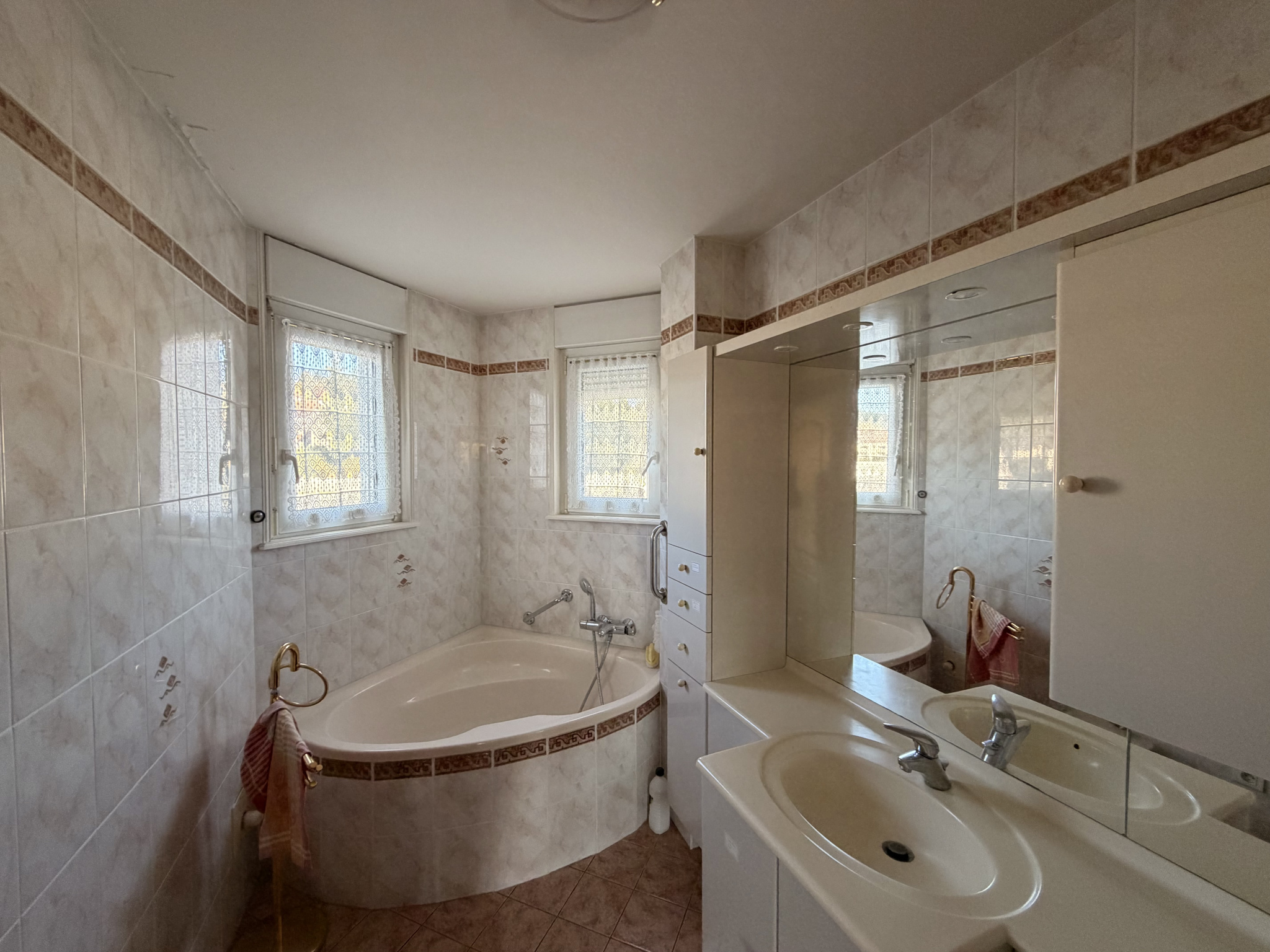 Salle de bains fonctionnelle ( deux fenêtres, douche et baignoire) .
