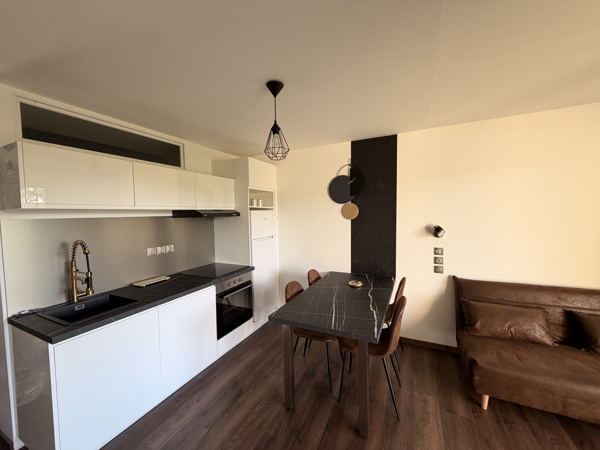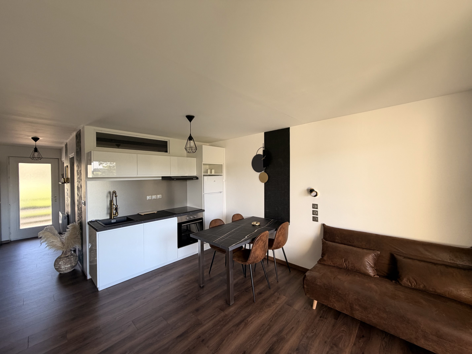 Entrée avec grands dressings , cuisine ouverte et équipée , très belle pièce de vie agréable et lumineuse .