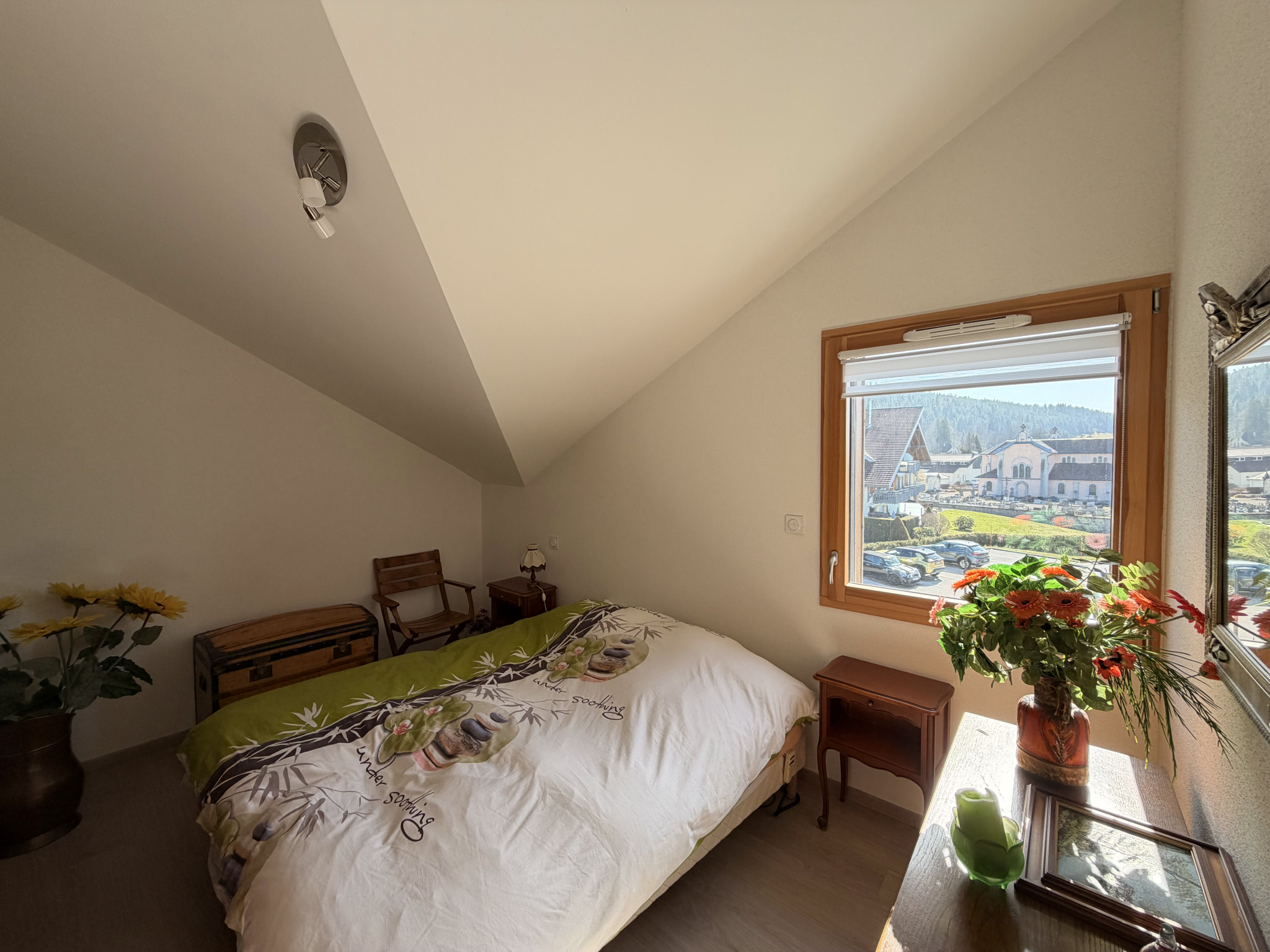 Comprenant : Belle entrée , une pièce de vie agréable avec cuisine entièrement équipée , accès à deux terrasses offrant chacune une très belle vue lac et village .